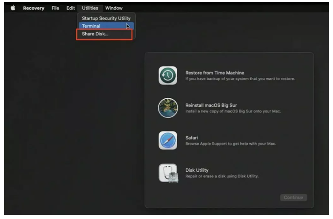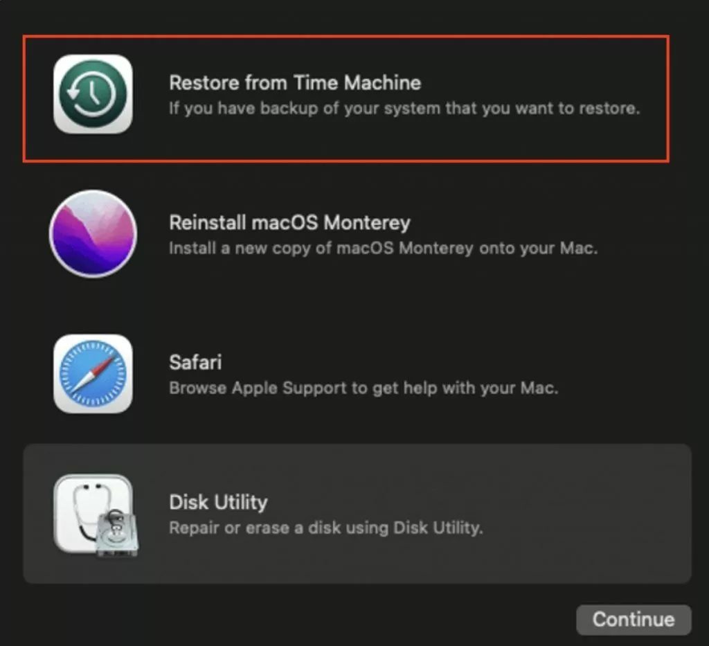- Choose Options, then click Continue to enter macOS Recovery Mode.
