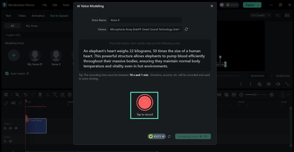 Re-recording missed lines wastes both focus and time. Voice Clone learns your tone and recreates your voice when needed. You record once, and Filmora copies your sound style perfectly. Then you type new words, and it speaks them in your voice.